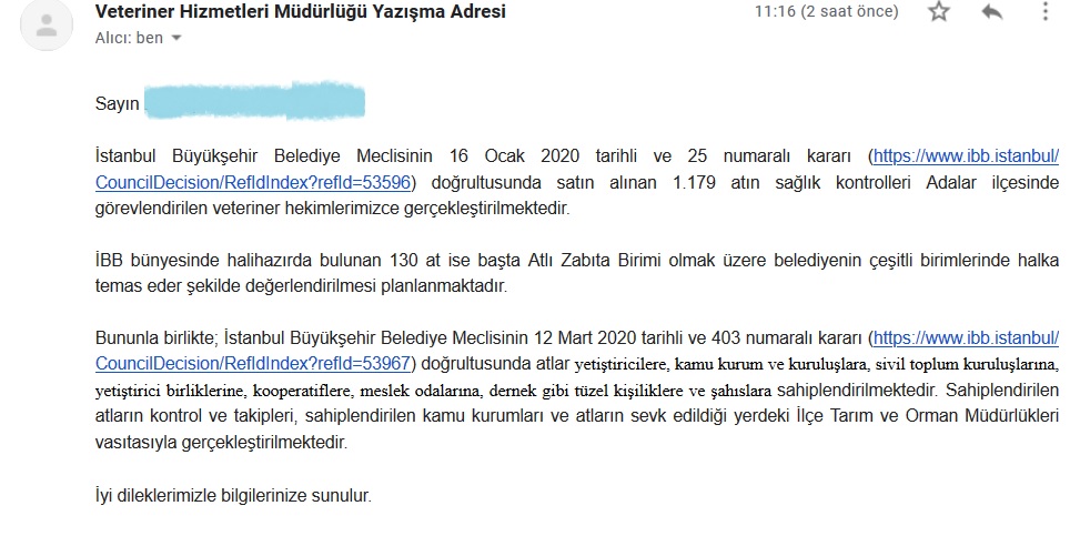 15 Eylül 2020 (bugün) İBB’nin bize yaptığı yazılı açıklamaya göre “hazlihazırda bulunan 130 at” belediye birimlerinde kullanılacak.
