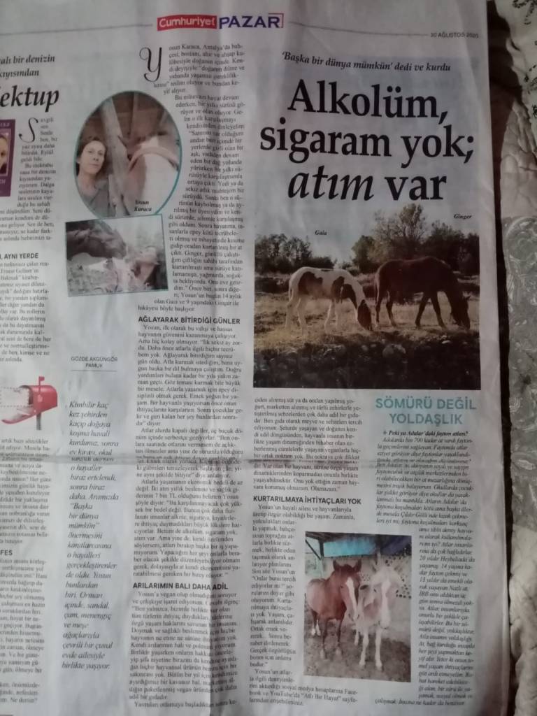 Yosun’un hayali ailesi ve hayvanlarıyla üretip özgür olabildiği bir yaşam. Zamanla, yolculukları onlarla yapmak, bahçesinin toprağını atlarla birlikte sürmek, birlikte odun taşımak olarak anlatıyor planlarını. Son söz Yosun’un: “‘Onlar bunu tercih ediyorlar mı?’ sorularını duyar gibi oluyorum. Kurtarılmaya ihtiyaçları yok. Yaşam, çalışarak anlamlıdır. Ortak emek vererek… Sonra beraber dinlenerek. Gerçek özgürlüğün bizim için anlamı budur.”