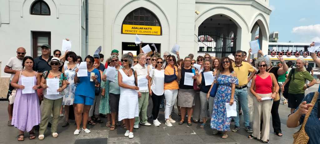 İmar Planına itiraz eden Adalıların sadece bir kısmı, Çevre ve Şehircilik Bakanlığı’na dilekçe vermeye giderken Kadıköy’deki Adalar İskelesi önünde.