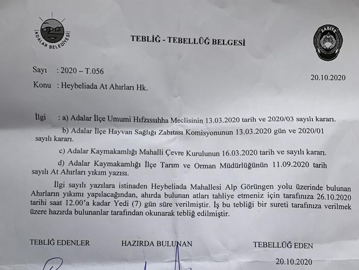 Heybeliada’da at ahırının 26 Ekim 2020’ye kadar tahliyesi için tebligat geldi (20 Ekim 2020).